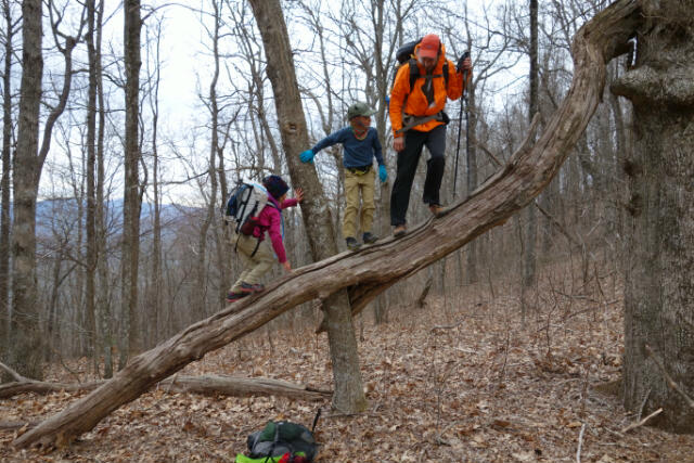 Today officially makes this our family’s longest hike. Cartwheel ponders the mountains between her and home. The kids follow dad up a steep sidetrail that dead-ends in a tree. Orion, as always, is in high spirits (while we don’t call him by a trailname because it took us long enough to get him to come with his real one, the kids have affectionately dubbed him Battering Ram because he hasn’t yet realized the extra girth his pack adds as he charges past). We managed a successful resupply where Dad hitchhiked into town, did the shopping, made it back to the trail, and made it the four miles to the campsite just an hour after Mom, Cartwheel, Mouse and Orion.