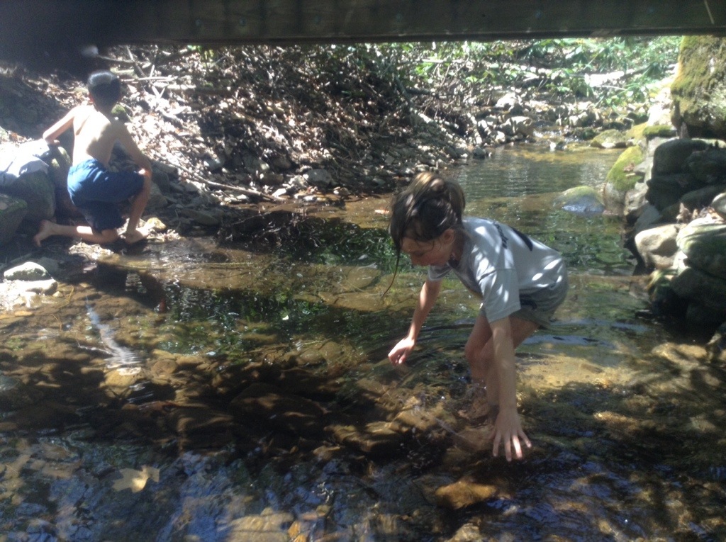 Back at the hostel, the kids socialized with the hiking crowd while mom and dad repacked the food bags. A few of the hammock sleeping hikers we met the night before rolled in around lunch, and after a few conversations, we found ourselves the owners of a new ultralight hammock that RobinHood is trying out for his new sleep system (if successful, Cartwheel may follow suit leaving the parents with the privacy of the very own tent–albeit with micro-thin walls). In the early afternoon, we headed out and had a beautiful hike up out of e Nolichucky river valley. The trail followed gurgling brooks the whole way, and the hot sun lead to some dunks in the tempting water.