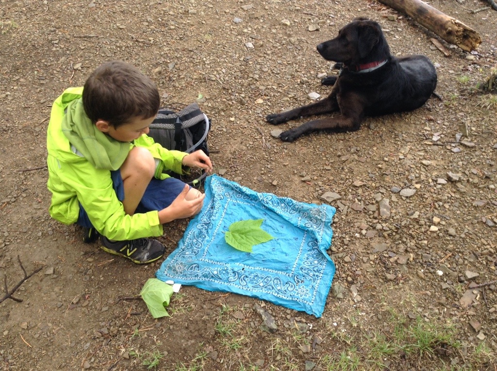 Only small fish to report (though several of them). And RobinHood attempted unsuccessfully to create a flag by stitching a striped maple leaf to a bandana with greenbrier thorns.