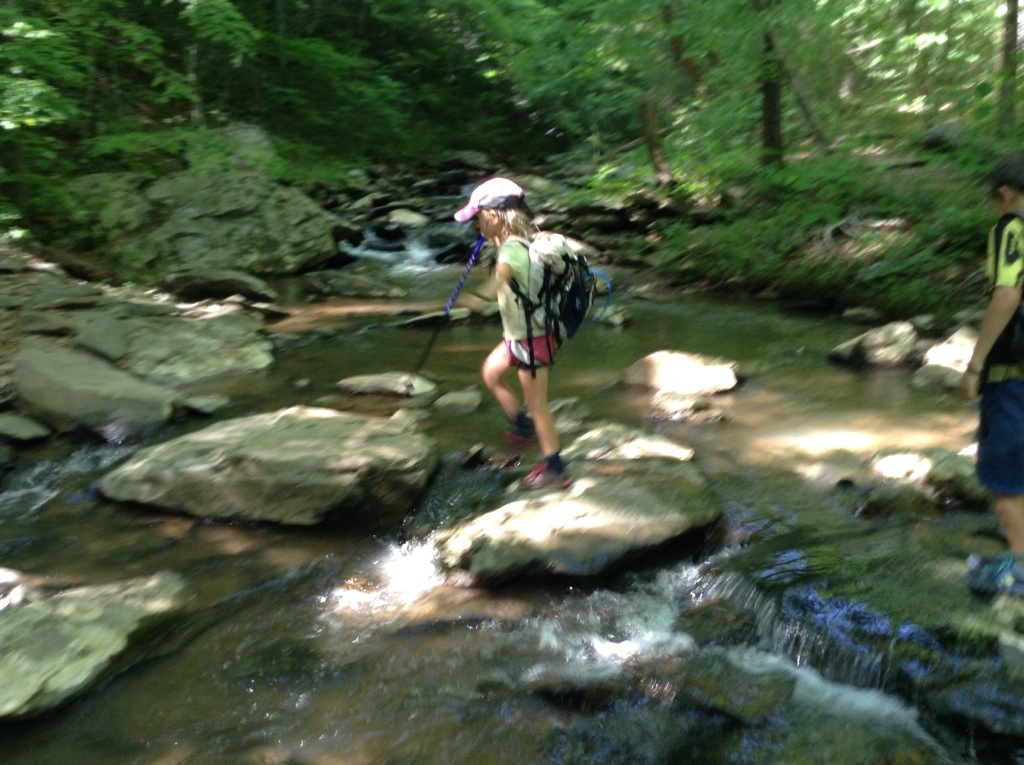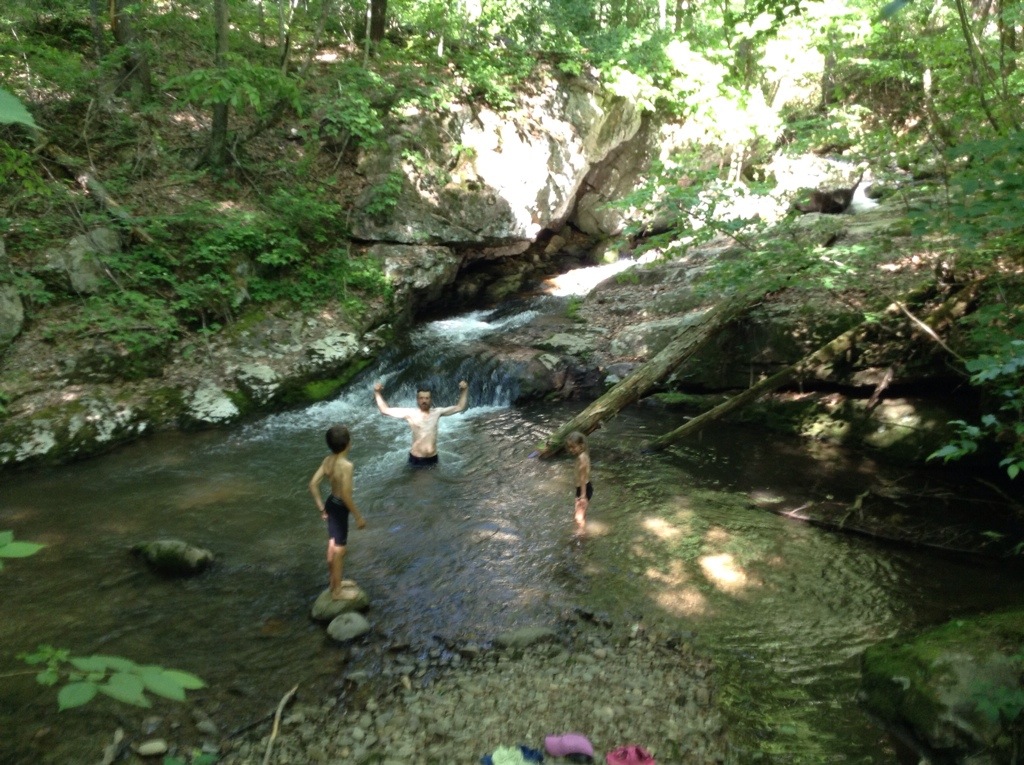 We have friends from the Maine USGS office (science for a changing world) who are down in Virginia doing some surface water sampling, so we hiked briskly to meet up with them by the end of the day, stopping to swim in a stream; stopping again to swim in a reservoir; stopping again to swim in a creek… We arrived at the road minutes before they rolled up in their large sampling van. We all piled in to head into town and enjoy a nice dinner and catching up on the goings on in Maine (the kids were excited to get a photographic update of all the things their friends Jack and Maeva have been up to back home–and the parents’ hearts go out to Collin who’s doing everything back home while Charlie is out sampling).