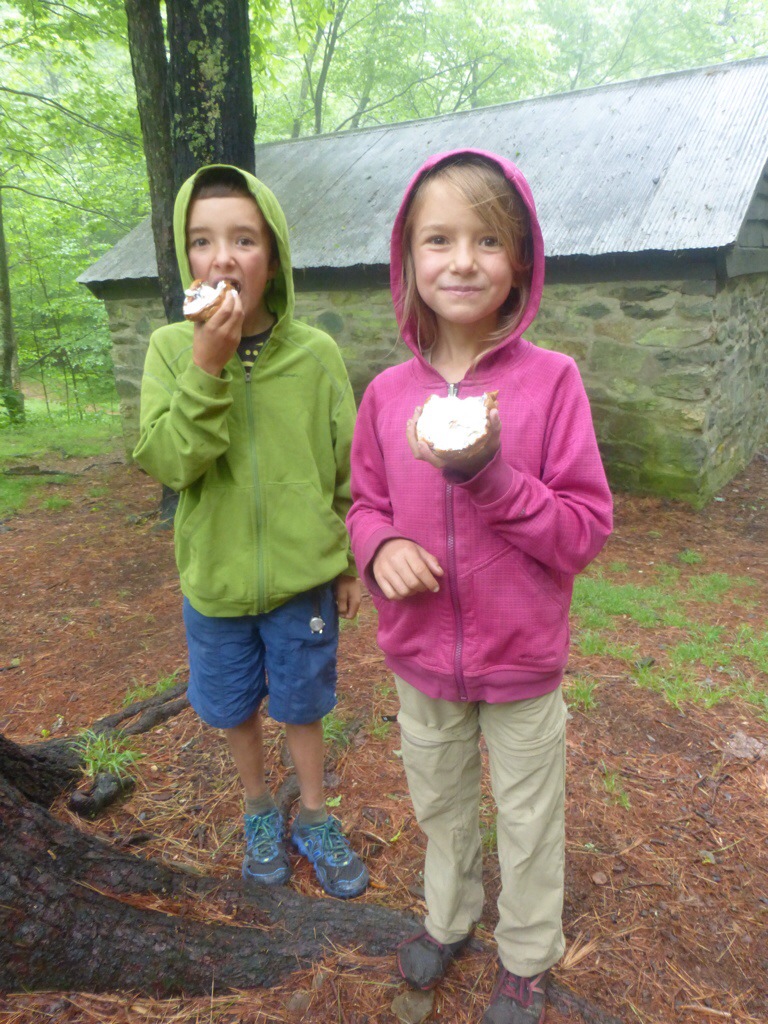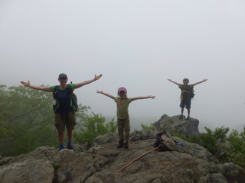 By the time he caught up, he was dripping with sweat in the still humid air. The kids had been cruising at Wired’s three mile an hour pace, so they were hard to catch. The day was spent swapping stories. The kids really look up to her (RobinHood has declared that he wants to Triple Crown someday) and the parents had a great time hiking with someone their own age who also shared their hiking style. The day brought sightings of newts, tree frogs and deer. And the kids joined wired in her signature arms-spread pose.