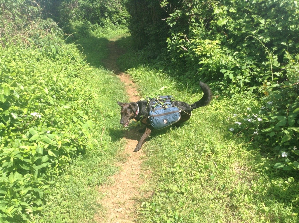 At one point Orion could hear some birds moving around in a deep briar thicket. He perked up, but paused at the impenetrable brush, then he reared up and pounced through it. There was much rustling and he emerged again covered in briars and vines (the birds flew off easily). I was chuckling too much to get a good photo, but this attempt was more successful on his part than a previous attempt to dive into some thick rhododendron. Those woody stalks were too springy for him and he only made it about halfway in before they launched him backwards (seeming to spit him out) all the way across the trail.