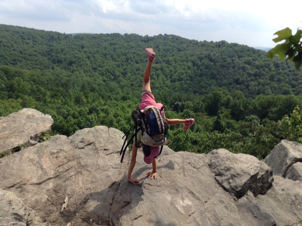 Today we crossed the 1,000 mile mark. We also left Virginia (the longest state along the trail, making up almost a quarter of its length), and Cartwheel kept up her rotating regimen. All this occurred on an up and down section of the trail known as the roller coaster (note the picture of everyone throwing their hands up in the air on one of the fast down hill sections). For more play acting pictures by the kids, see the same day’s post by Wired.
