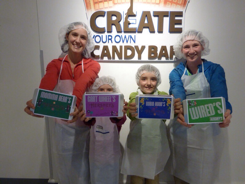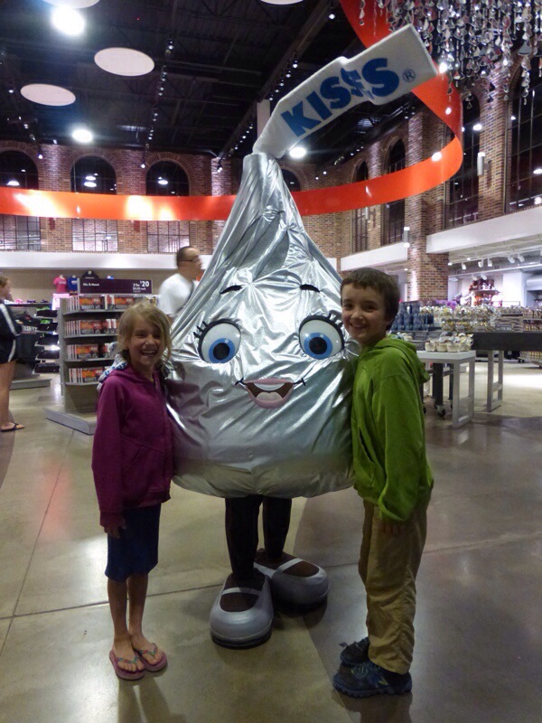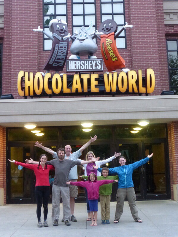 We made it to town with plenty of time and picked up our packages. We watched the ducks, geese and swan swimming in the pond of the town park. And we hatched a plan with Wired (who was simultaneously reaching the town 25 miles north of us), to coordinate one last adventure together before she flew away north. Wired rented a car and picked us up, taking us to the house of another serious long distance hiker (Malto who hiked the PCT in the same high-snow year that Wired did). Malto (whose daily mileage while hiking generally hovers a little over forty miles) lives and works in Hershey,PA. The kids enjoyed a trip to Chocolate World, had a chance to make their own chocolate bars, and then snuggled with Malto’s Great Pyrenees back at the house.