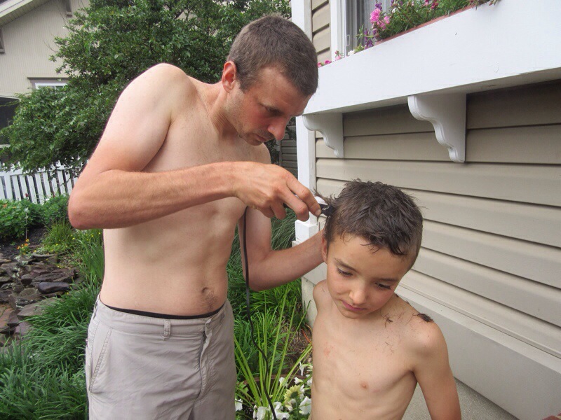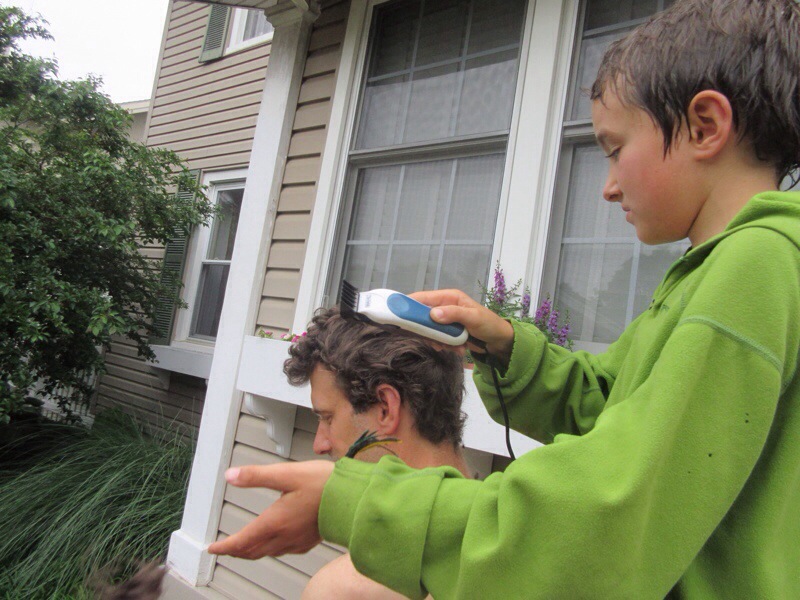 After a late night at Chocolate World, we enjoyed sleeping in at Malto’s house. We got up to pancakes, sausage and eggs. It was misting and wet after a night of thunderstorms and our motivation to hurry back to the trail was low. RobinHood and All In took the opportunity to give each other summer haircuts.