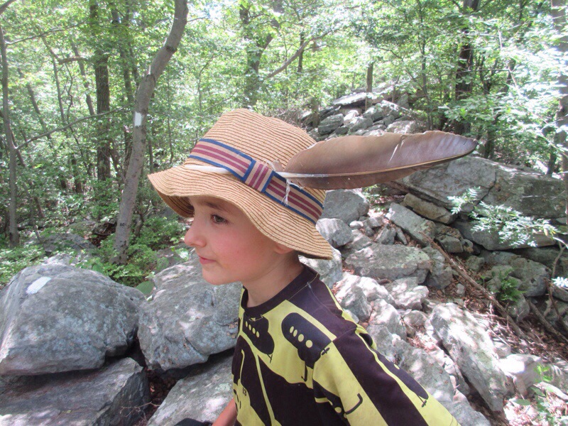 RobinHood cruised behind Whitey over the rocks, and we’d gone five miles in an hour and three quarters. The kids couldn’t keep that pace up the big climb, and Whitey cruised ahead. Once they were again following their parents, our pace slowed considerably (E=m*(1-2c)^2). We had a nice lunch at Wolf Rocks and polished off most of the remainder of our food bags (it’s always satisfying to walk into town with an empty food bag). Cartwheel took pictures of the abuse her feet had suffered on the rocks, and RobinHood found a feather for his cap. With so little food weight, the parents took the kids’ packs for the rest of our trip into Delaware Water Gap.