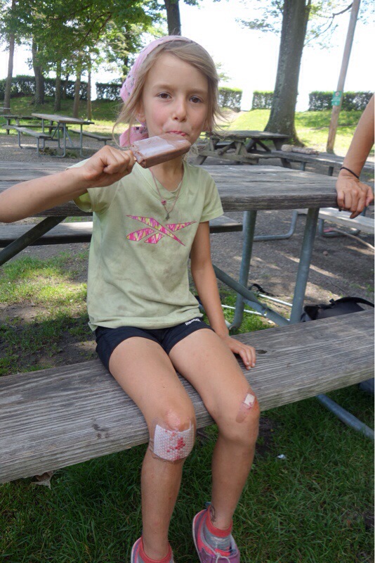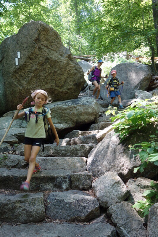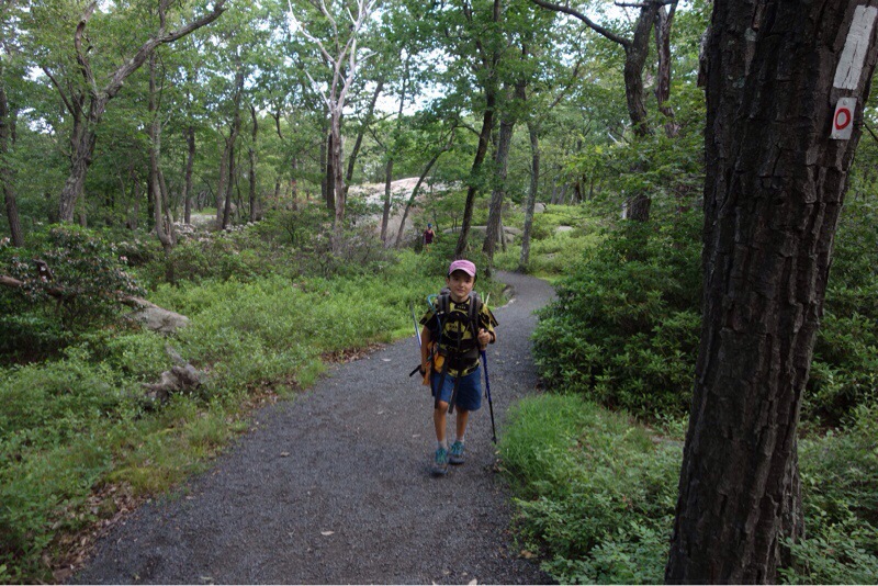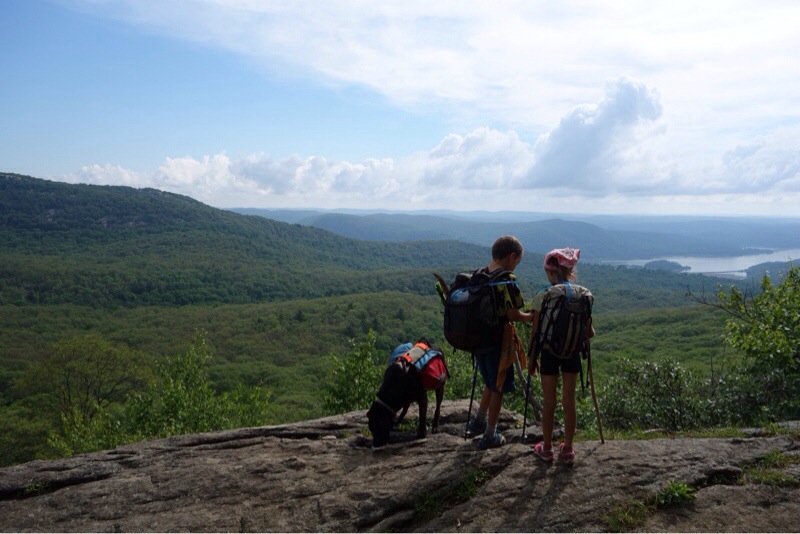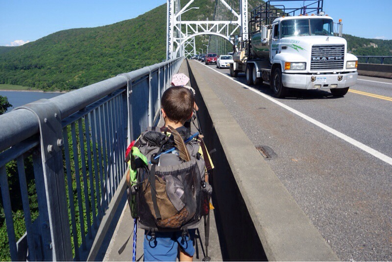 After the previous night of marveling at the bright lights of the big city, we awoke, descended the ridge, climbed the many stone steps up Bear Mountain, then descended the many steps down the other side. As we emerged in the park at its base, the kids’ call rang clear and loud: PLAYGROUND! They dropped their packs and took off running. Cartwheel managed two full-speed steps on the pavement before a stuttered step sent her sprawling across the gravelly macadam; Cartwheel’s been learning to get up again a lot lately.