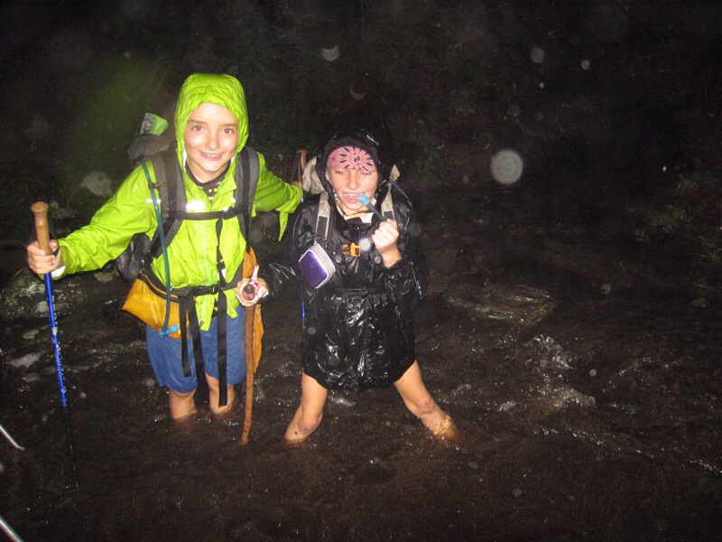 They were excited to learn about the wasp larvae that create the bulbous oak apples that they’d been calling pow-pows after the sound they make when stomped on. The sudden rains brought flash flooding (while the flash over the photo obscures the background, the kids are actually standing on the trail with water up to their knees).