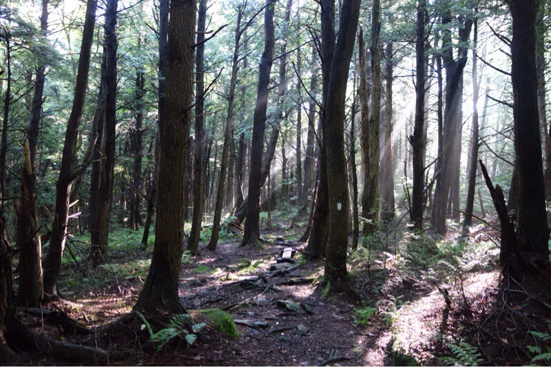 The rains came hard overnight but we all stayed dry and the heat finally broke. The morning brought ethereal light sifting through rain sparkled trees. The trail was pretty, the weather was perfect, and the hikers were crabby.