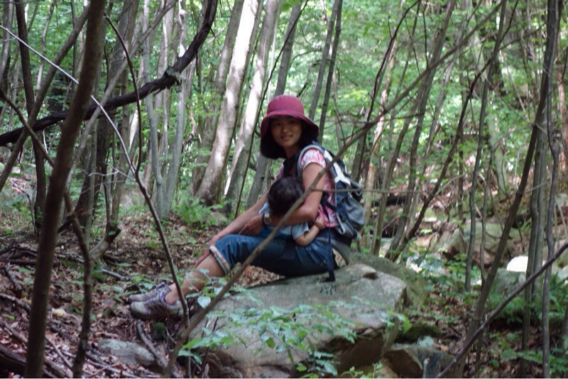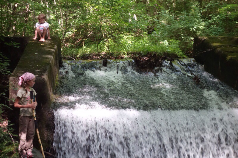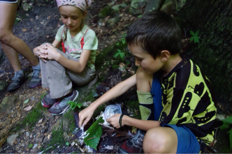 The kids and their cousins swam in the streams and goofed off together. The adults recreated some of the photos from our first trip with Mama Bear’s grandfather’s walking stick (cut in Georgia at the end of our southbound hike in 2002) held his remains. The kids built and launched a funeral ship made from twigs bark and leaves to carry their great grandfather down the river.
