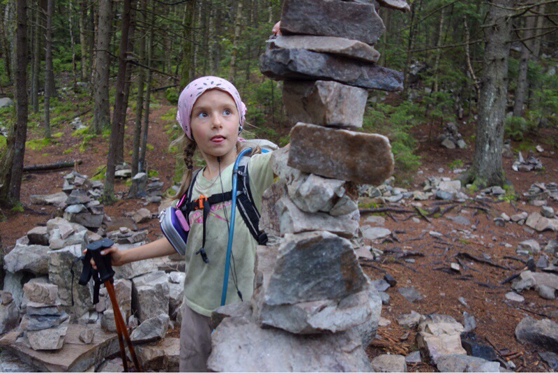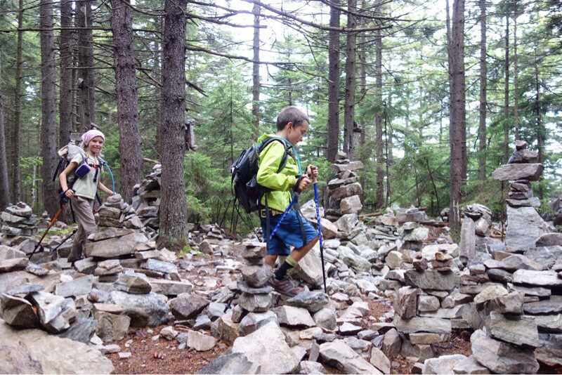 The morning started with hard rain and we ate our breakfast huddled under the hammock tarp. It had slowed to a drizzle by the time the kids and Mama Bear started hiking. I packed up the wet tarp and started soon after. While I was hurrying to catch up, I took the opportunity for a morning swim in rocky pond. The silver mist rose slowly from the ponds surface and the soft drizzle rippled the mountains’ reflections.