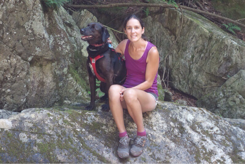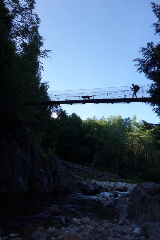 Wonderful shot of dog and hiker (Emily?) on bridge.