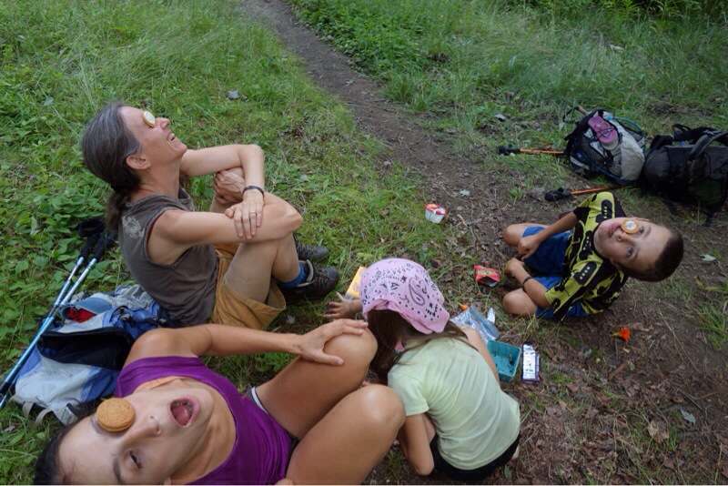We were treated to a delicious breakfast by our host Sophia Stone. Then we hit the trail for a few hours of rolling trail blanketed in soft pine duff until we met our friend Alison. The kids were excited about the reunion and enjoyed the company of an irreverent adult willing to goof off as much as they were.