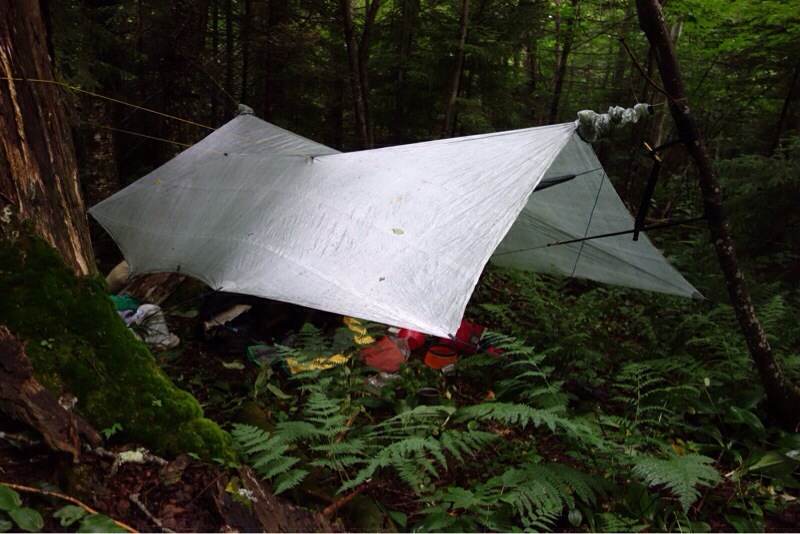 The skies darkened faster than the water boiled, and soon a hard rain began to pelt the forest canopy above our heads. We quickly pitched a tarp in the woods to the side of the trail and moved the dinner preparations under the shelter it provided. After dinner we decided to camp for the night rather than push on in the clouded darkness of the wet weather.