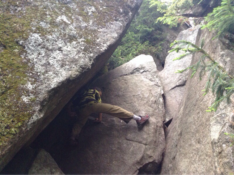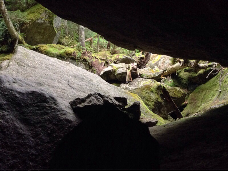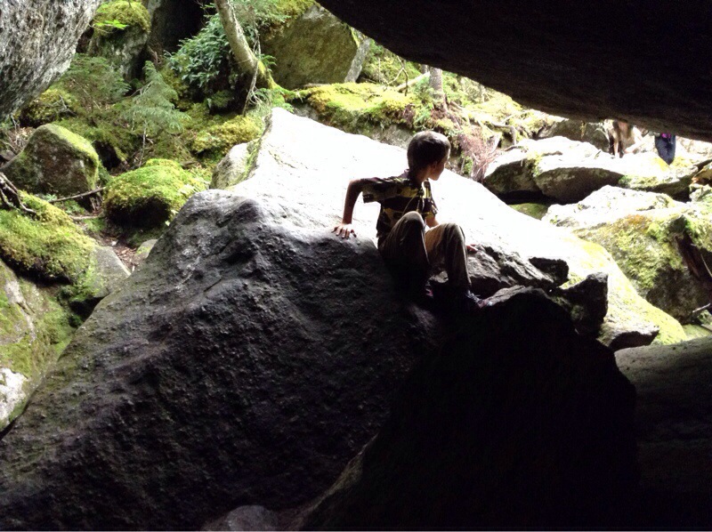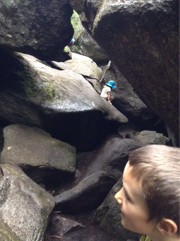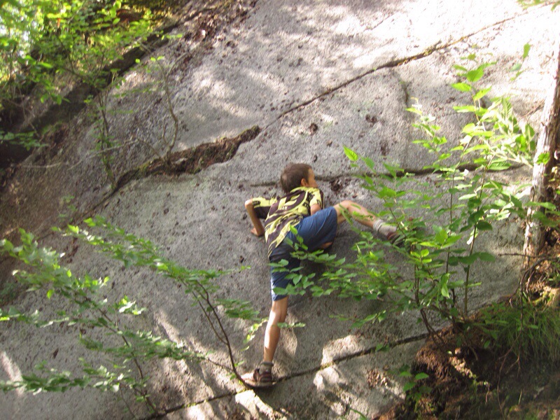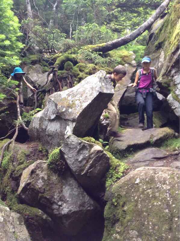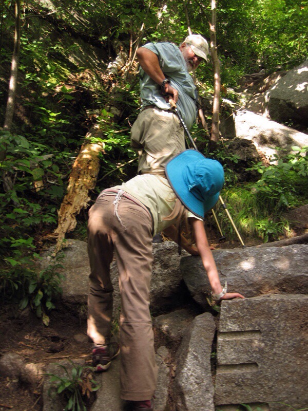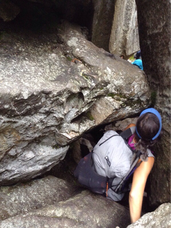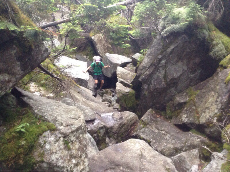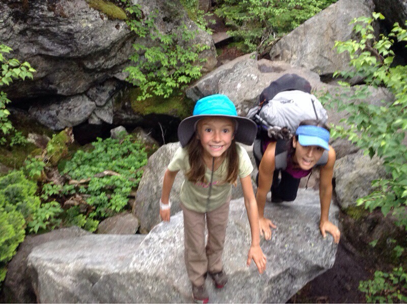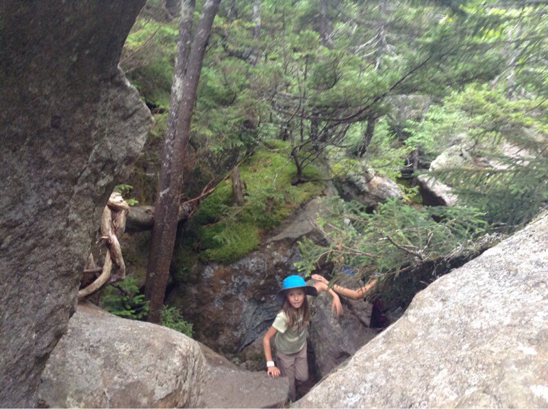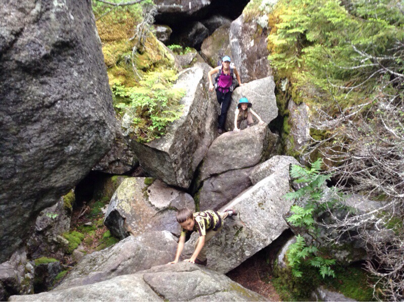We cruised through the jumble of boulders that fill the basin of Mahoosic Notch. The kids jumped, scurried and scrambled over, around and through them. Orion, with his pads toughened by almost two thousand miles of trail, scrambled and scratched his way up steep slopes and fearlessly charged head-first down and around the granite obstacles in his path.