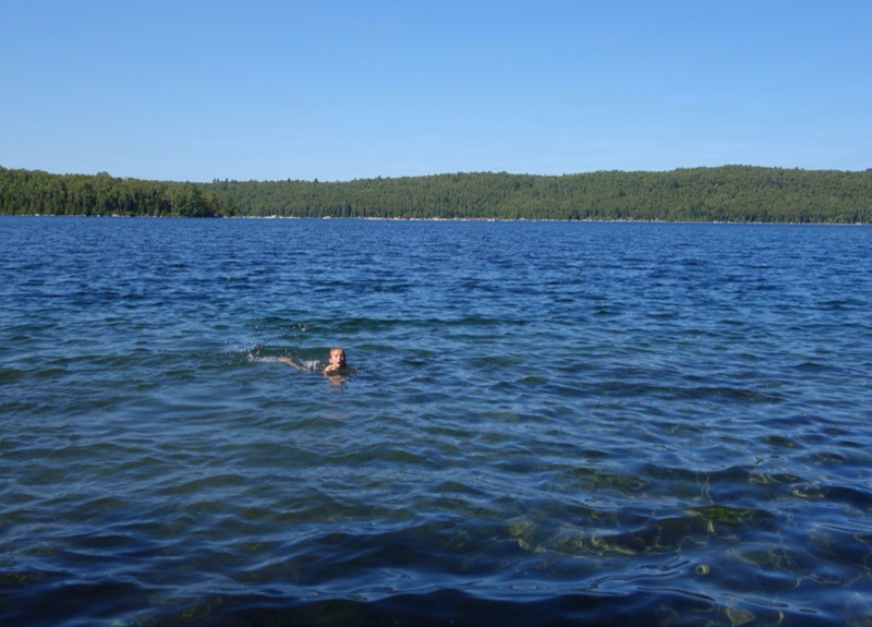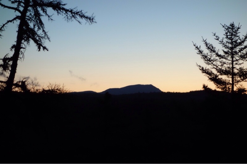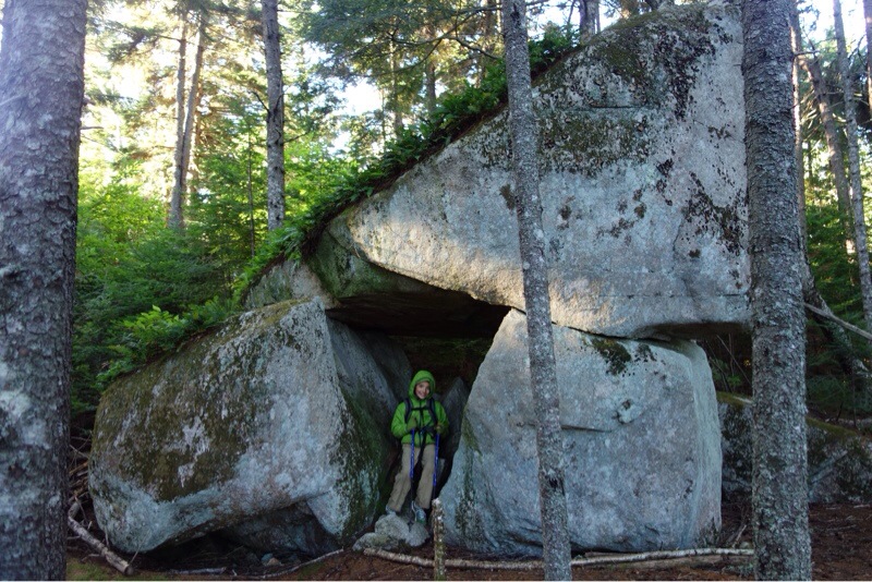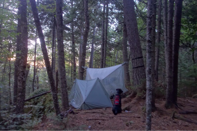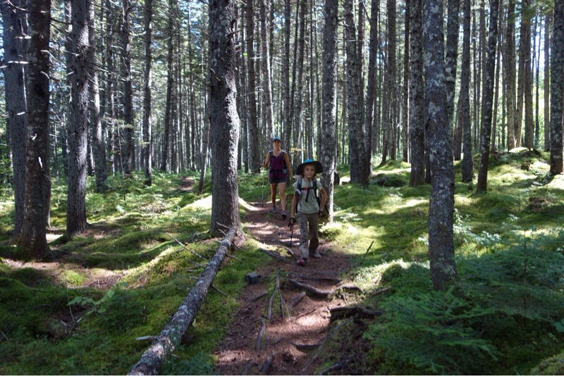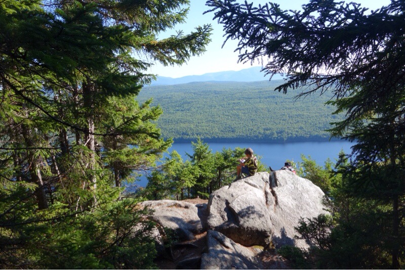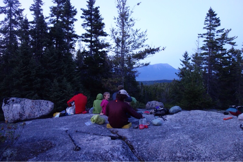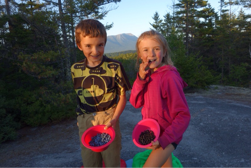 Our last day in the. Hundred-Mile Wilderness, we spent the evening on Rainbow Ledges enjoying the hemlock-framed view of Katahdin. We were joined by fellow thru-hikers Spider-Man, Blink, and. Bear Juice. The short day afforded plenty of time for lounging, swimming and berry picking. The kids stained their mouths blue with the juice of the abundant wild blueberries and huckleberries growing along the ledges.