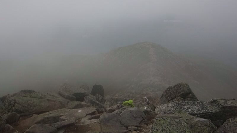 The ascent was clear with spectacular views of the morning sun on distant peaks. But the strong winds blew the moisture in from all around and the cloud level seemed to lower by the minute. As we climbed the Hunt Spur, we watched the thru-hikers ahead of us crest the spur and then become enveloped in white. We had a similar experience, and once we reached the tablelands the visibility dropped dramatically with wet whiteness whipping by, drenching our hair and lashes.