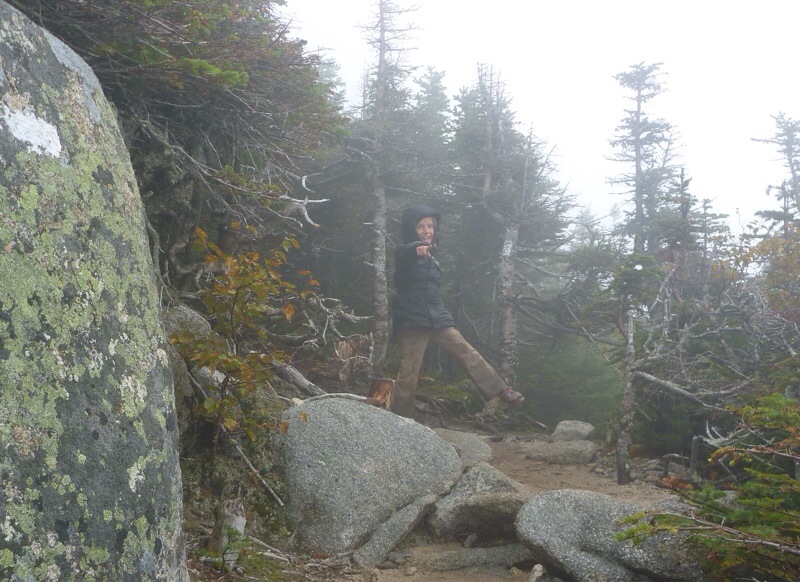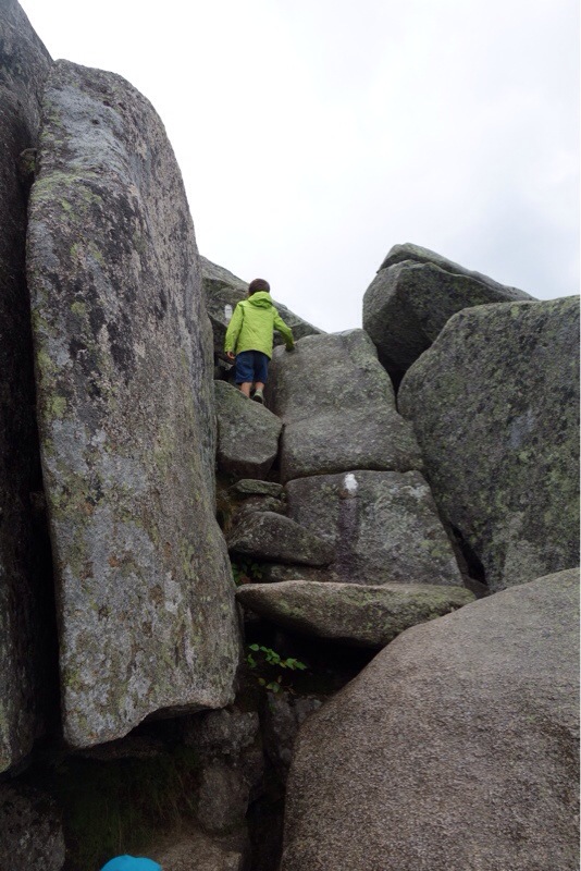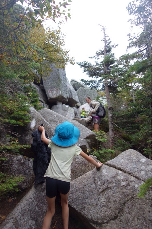 Minutes after leaving the peak, we met Mama Bear’s parents and turned around to re-summit with them while the other thru-hikers continued their descent. The six of us had some time to ourselves on the top before we headed down. The kids marveled at their transformation into southbound day-hikers now that their long trek was behind them. The descent was slippery with the wet rocks and Cartwheel finished off with one last superman-style trip that knocked the wind out of her as a sort of accidental tribute to our friend Sautée, with whom she shared this unfortunate habit. Her grandfather later followed suit in dramatic, grabbing RobinHood’s arm for support and pulling him down as well. We made it down safely and everyone was eventually able to laugh about their accidental antics.